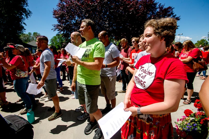 The supporters and teachers wore red T-shirts and some carried signs in front of Innovations High School during the upbeat event organized by the Salt Lake Education Association.