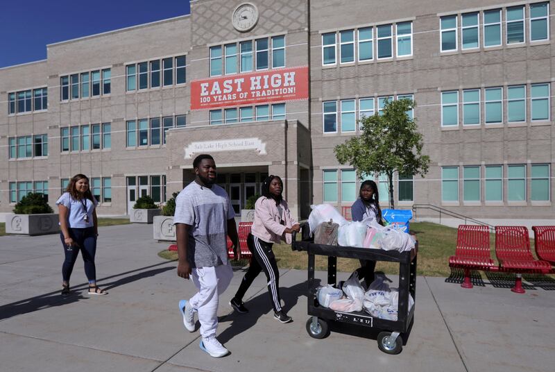 “East High School is great,” said Islam Djobo, who graduated from the school this spring. “I’m going to miss the school.” Islam and his sisters, Wali, Mouhina and Amida, were picking up meals and washing products for their family Tuesday at the Smith’s East High Leopard Stash.