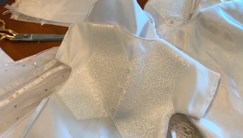 Each wedding dress can make more than two dozen gowns for both boys and girls, and the outfits come in four sizes, from 20 weeks to full term.