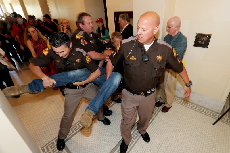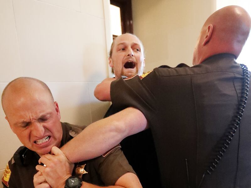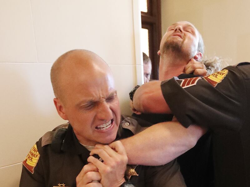 Petersen continued shouting as several troopers began forcing him out of the room.