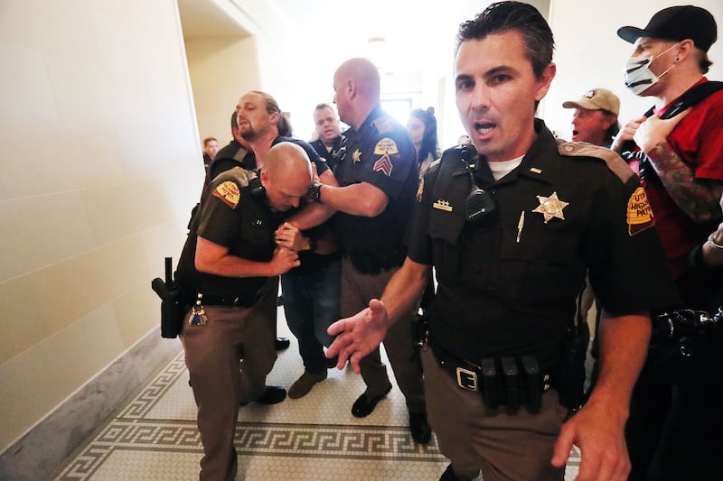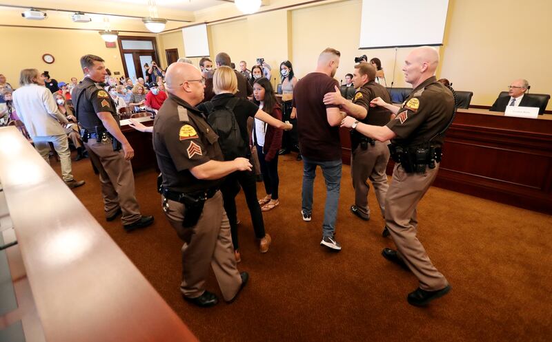 Protesters with the group Civil Riot swarmed the port board meeting — many wearing surgical face masks marked with an "X" — ran to the front of the committee room at the Utah State Capitol, some locking arms as nearly a dozen Utah Highway Patrol troopers jumped into action to escort them out for violating rules of decorum.