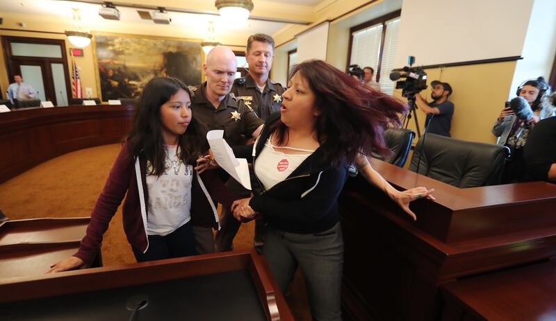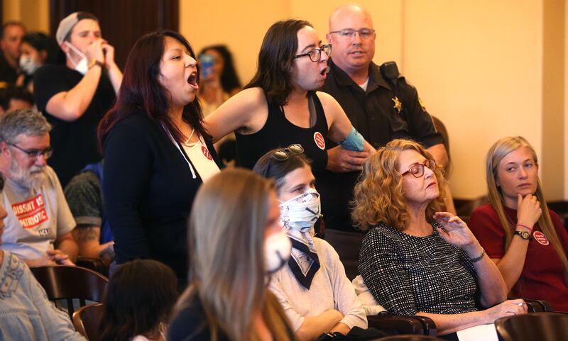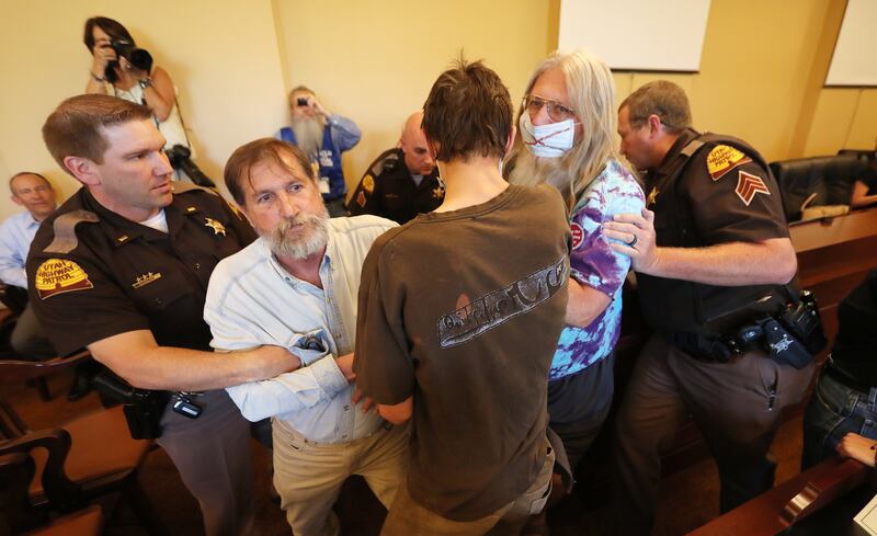 Petersen was later booked into the Salt Lake County Jail for investigation of interfering with an arresting officer and interrupting an official government meeting, according to jail records. Three others were cited and released for interrupting an official government meeting but weren't arrested, according to Utah Highway Patrol Sgt. Nick Street.