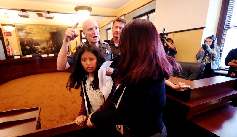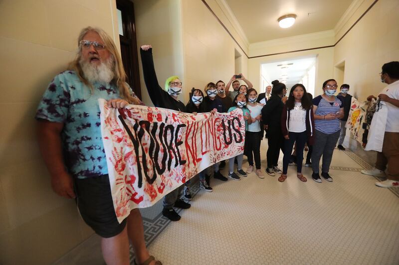 "We're going to rise up like water," protesters sang from the hallway. "We're going to shut this crisis down."