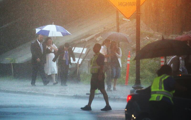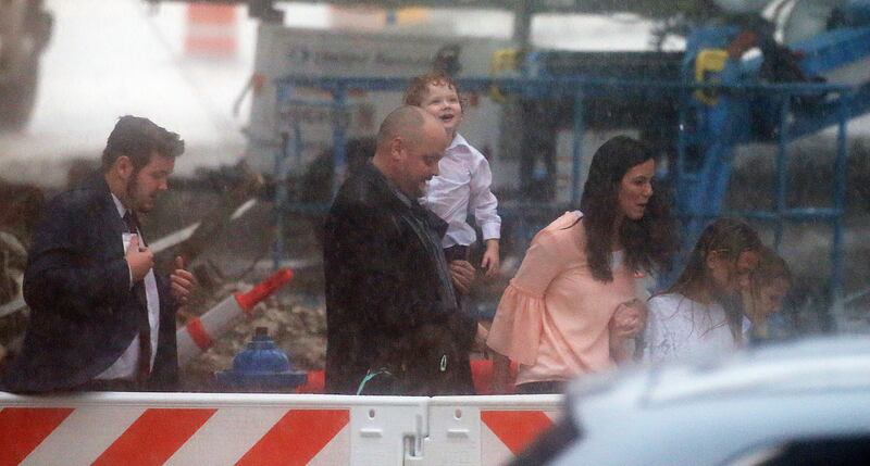 Thousands of Latter-day Saints braved a sudden and violent rain storm to participate in the meeting, many arriving soaked to the skin.