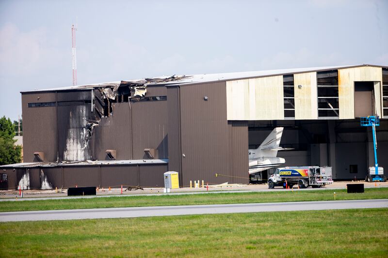 The crash left a gaping hole in the hangar, which sits not far from a busy commercial strip and densely populated residential neighborhoods of the northern suburb of Dallas.