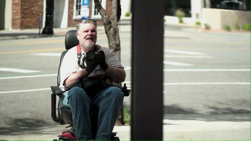 "Sorry," said a woman rolling by on her own motorized wheelchair, apologizing for inadvertently driving directly in front of Johnson's lens. "No," he reassured her, "I'm taking pictures. Can I take a picture of you?" As she says "no" and zips away, Johnson calls after her, "I love your chair!"