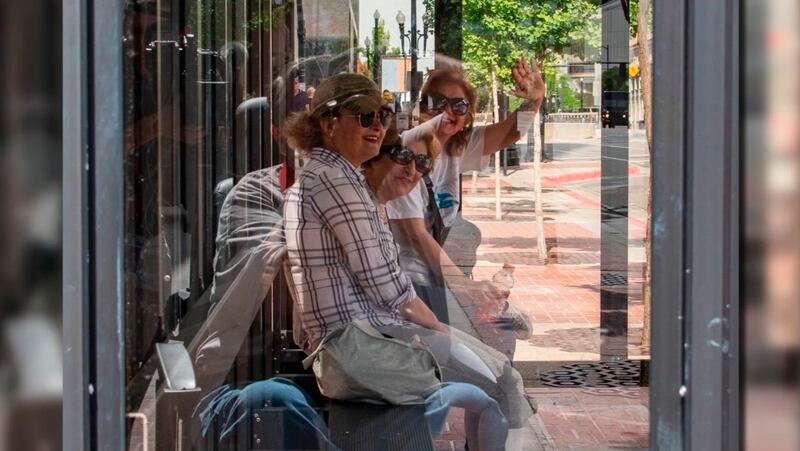 With his camera he documents the life and rhythms of downtown Salt Lake City, pausing here and there to capture some of its visual poetry. But mostly when he's on the streets, he shoots people. He rolled up to three women sitting in a bus shelter, oozing politeness.