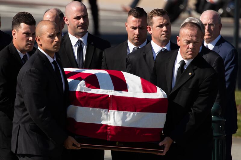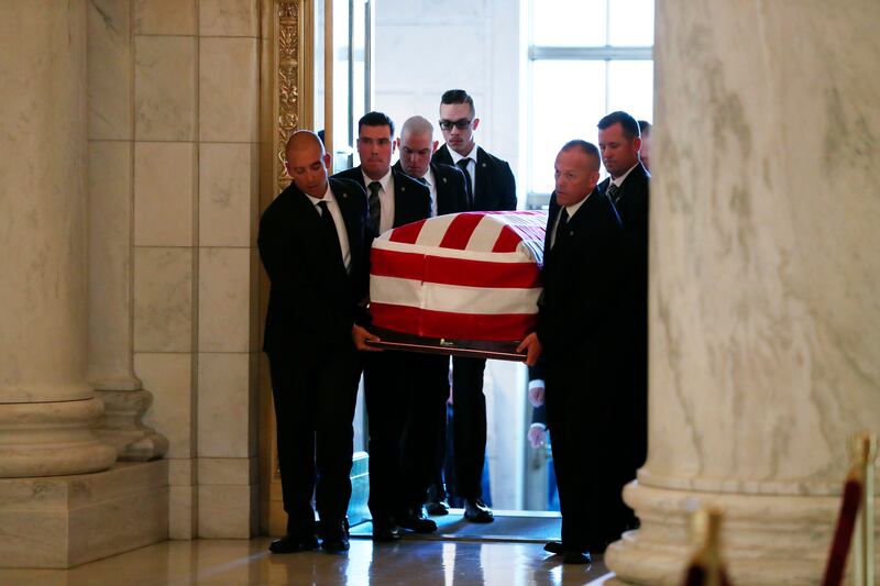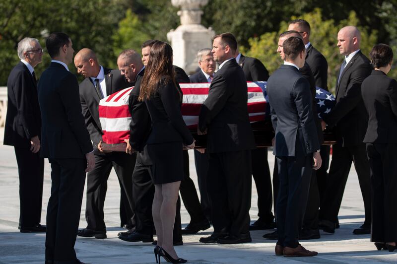 Stevens' casket was brought to the court Monday morning and placed in the court's Great Hall, in front of the courtroom. Supreme Court police officers carried his casket up the court's steps, which were lined with Stevens' former law clerks. Stevens' family members, some of them wearing Stevens' signature neckwear, a bowtie, were also present.