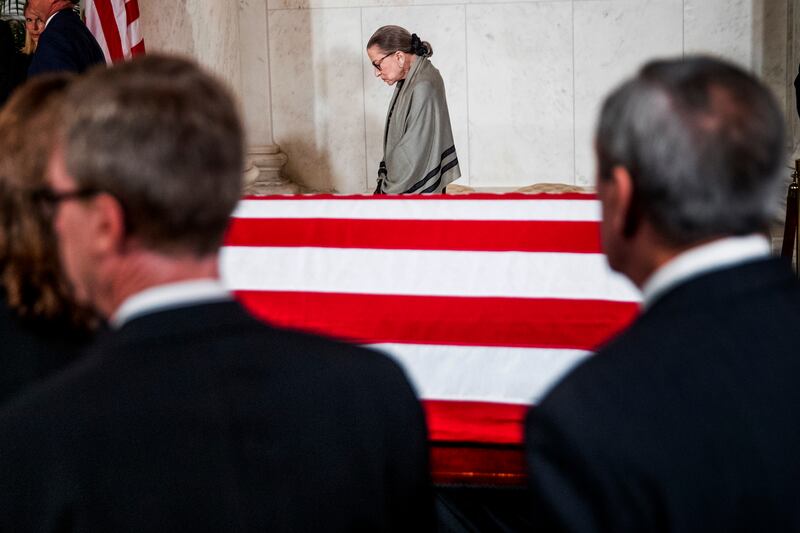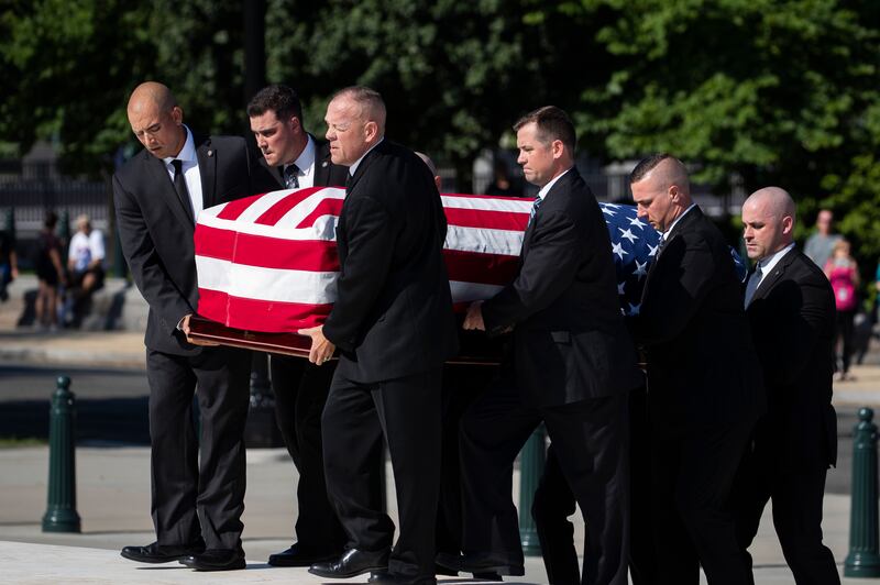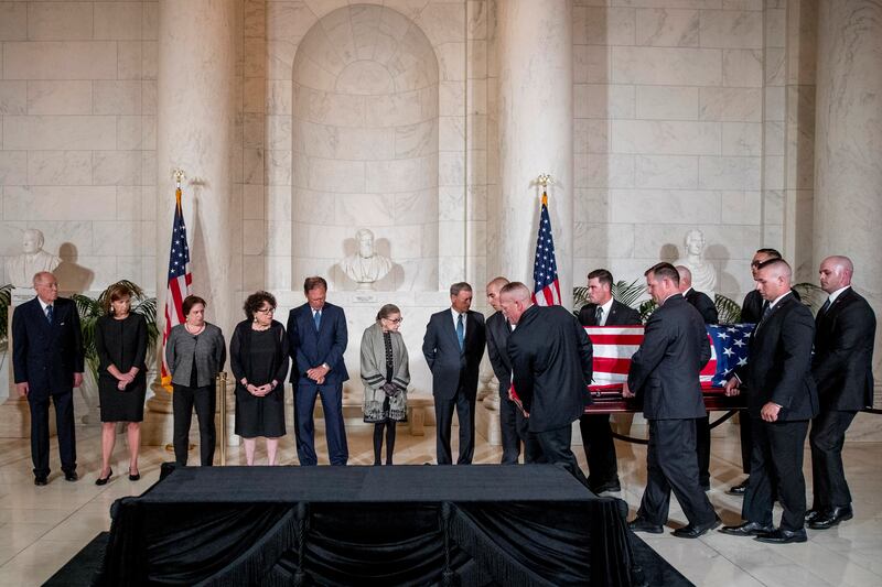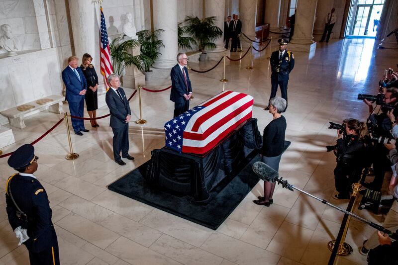 President Donald Trump and first lady Melania Trump were among those who visited the court to pay their respects. The two were greeted by Roberts and stood briefly before Stevens' flag-draped casket as well as a portrait of Stevens.