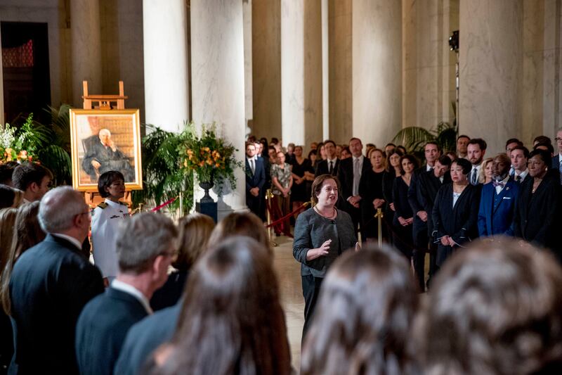 In addition to Kagan, five of Stevens' former colleagues were at the court for the ceremony. Chief Justice John Roberts and Justices Ruth Bader Ginsburg, Samuel Alito and Sonia Sotomayor attended along with retired Justice Anthony Kennedy. Other justices were unable to attend because of prior commitments, court spokeswoman Kathy Arberg said.