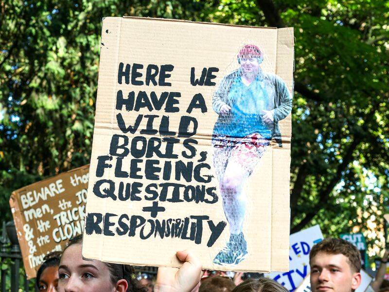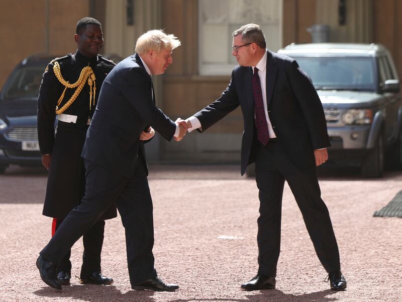 There was a brief hiccup in the smooth handover when Greenpeace climate-change protesters blocked Johnson's car by forming a human chain on the road outside the palace. They were quickly moved aside by his police escort. Later, hundreds of people demonstrated in central London against Johnson's support for Brexit and past offensive remarks about Muslims, women and others.