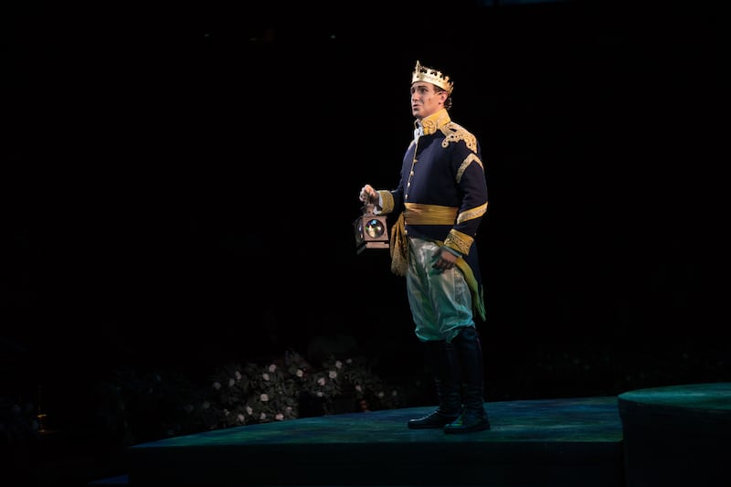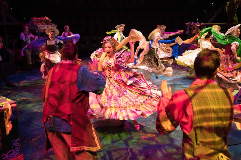 Other highlights included the absolutely breathtaking sets by Kacey Udy and costumes by Mary Ann Hill, which did not disappoint the tiara-topped young audience members. The pumpkin carriage that floated through the air was a masterpiece of golden latticework bedecked by twinkling lights and flowers. Cinderella’s frothy white ball gown was every bit worthy of a fairy tale, and her dazzling, spinning wardrobe transformations (there’s more than one) were a flicker-fast magic trick that evoked oohs and aahs.