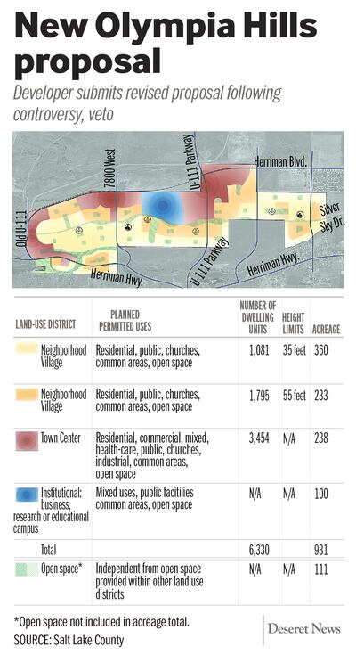 The developers of the project, named Olympia Hills, submitted last week their revised zoning application to the county — beginning a review and negotiation process that may make changes to the proposal in coming weeks or months before it goes before the Salt Lake County Council.