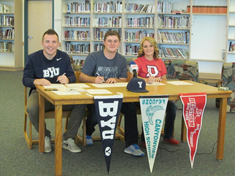 Canyon View celebrated three student athletes signing scholarships. Senior Keaton Kringlen signed to play baseball at BYU. Senior Zach Brinkerhoff signed to play baseball at BYU. Senior Kaitlyn Delange signed to play softball for Dixie State University.