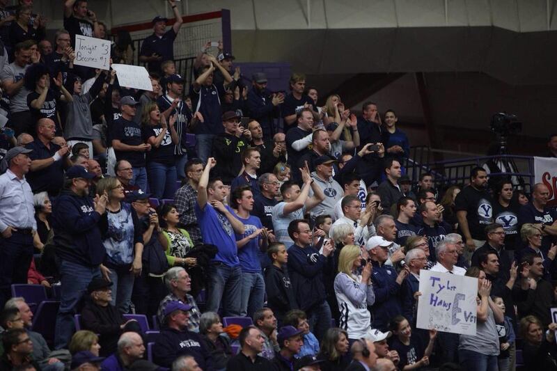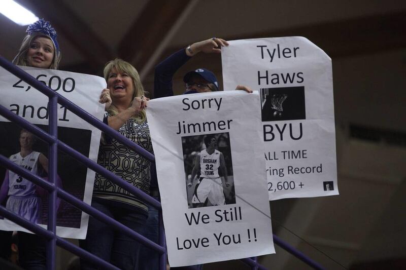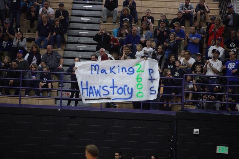 BYU fans cheered loudly when he scored the layup, and some held up signs commemorating the achievement. No, Haws didn’t break the record inside the friendly confines of the Marriott Center, but with thousands of Cougar supporters in attendance, at times it sounded like it happened in Provo.