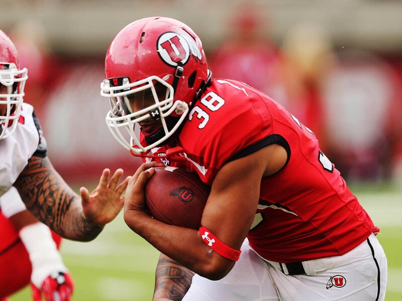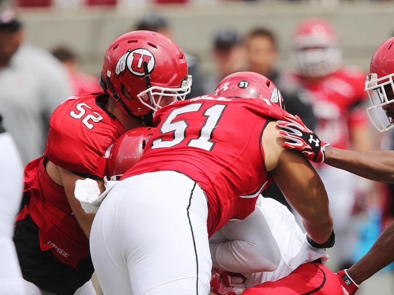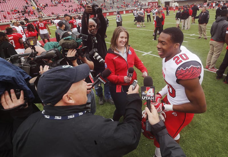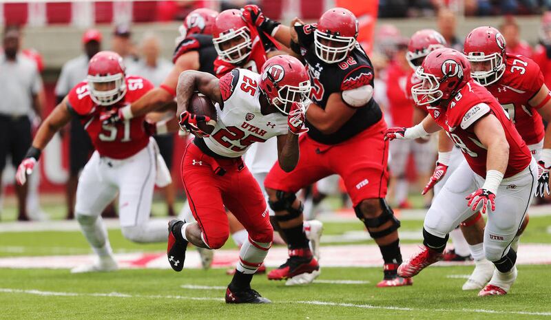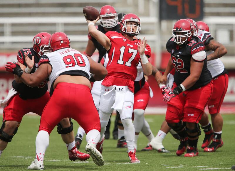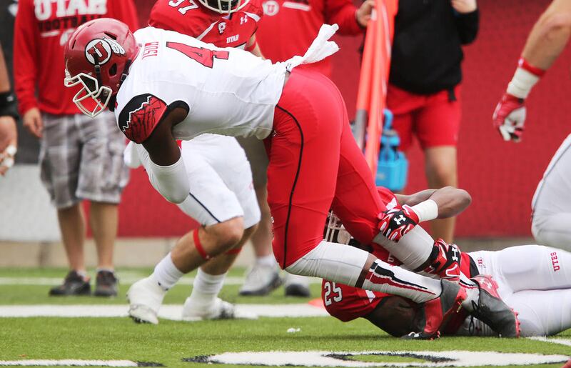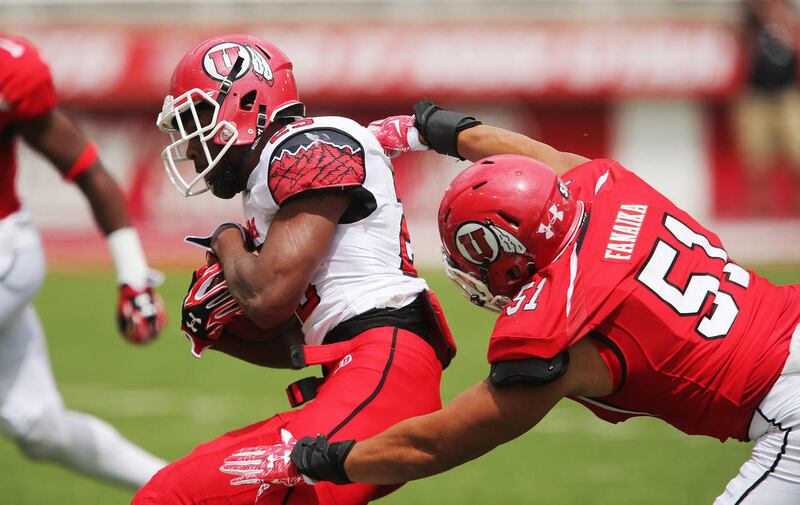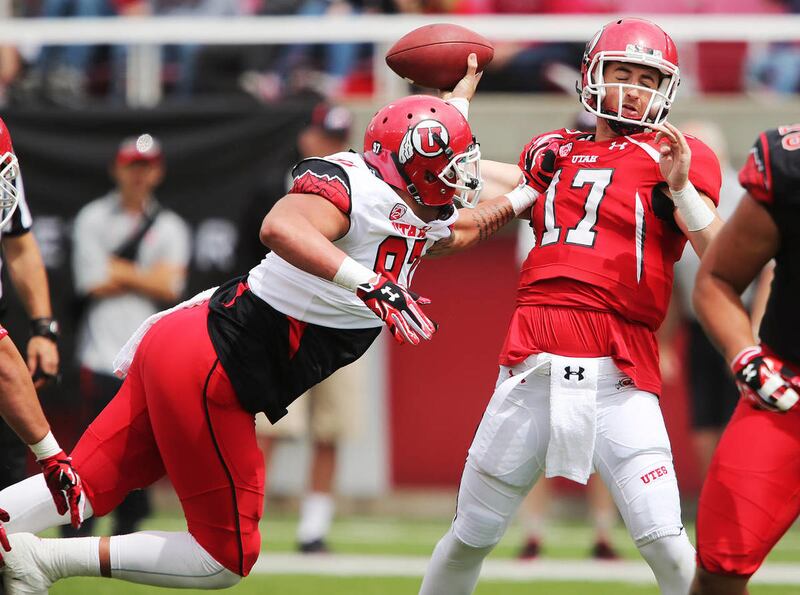 EXTRA POINTS: The White topped the Red 14-0 in the 12th annual MUSS game. Quarterback Andy Swanson was named MVP . . . Injured Green Beret Nate Harris and a group of boys who raised money to deck his van out to support the Utes were honored during a break in the game. They received football season tickets from Utah athletics . . . The Utah gymnastics and men’s basketball teams netted loud applause when introduced to the crowd of 12,224 in attendance . . . The 2015 Crimson Club Hall of Famer inductees were unveiled. The class includes the 1997-98 men’s basketball team that reached the national finals, Jamal Anderson (football), Alex Jensen (basketball), Melonie Kent (softball), Angie Leonard (gymnastics), George Seifert (football), as well as contributors Kay and Zeke Dumke Jr.