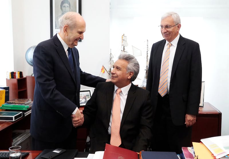 President Lenín Moreno, a 2012 Nobel Peace Prize nominee for his advocacy for people with disabilities, welcomed President Russell M. Nelson, a world-renowned retired heart surgeon, at Carondelet Palace for his first meeting with a leader of the church since his election in 2017.