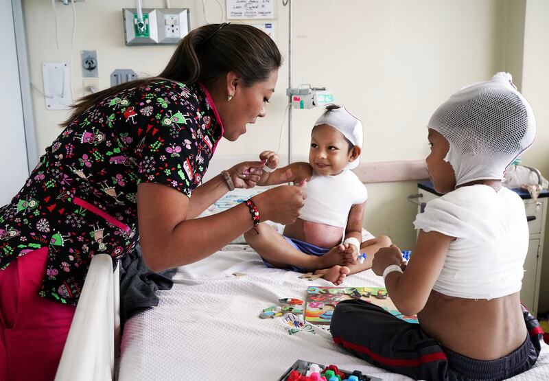 As the two leaders discussed humanitarian work in the government palace in Quito, a bright-faced teacher in equally bright hospital scrubs at a hospital 20 minutes away played educational games with two little boys who sat on a hospital bed, gauze wrapped around their heads and torsos. Each suffered serious burns a month ago when scalded by hot water.