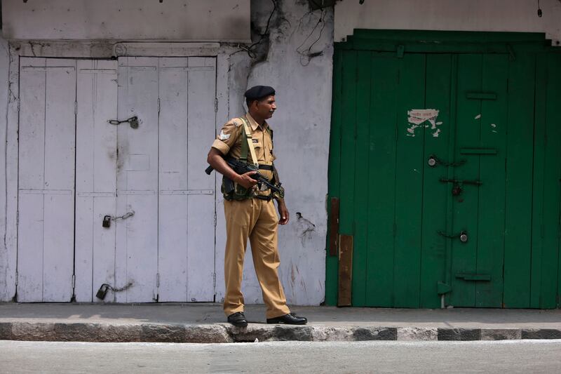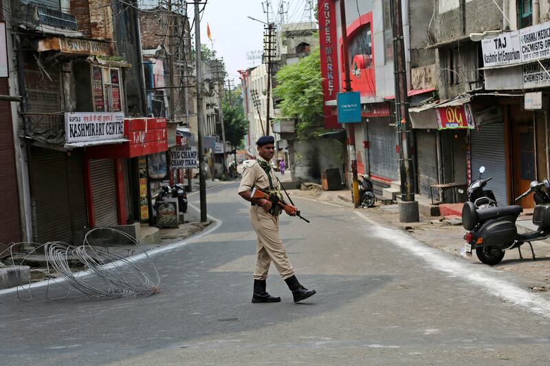 Indian TV news channels in Srinagar, the main city in India's portion of Kashmir, showed security personnel including armed soldiers in camouflage standing near barbed wire barricades in the otherwise empty streets.