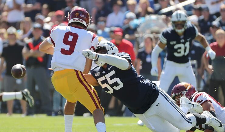 BYU’s first touchdown of the game came midway through the first quarter in unusual fashion. On third-and-1 from the USC 1-yard line, safety Austin Kafentzis took a snap and gave it Ghanwoloku, who followed defensive lineman Khyiris Tonga into the end zone to tie the game at 7-7.