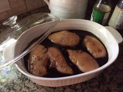 At the top of that collection is my mother’s marinade, a recipe now more than five decades old, for chicken. Raw chicken (breast, thigh, wing or drumstick) and three main ingredients combine for a foolproof meal. Marinate for at least an hour, the longer the better (even overnight works well), then bake or barbecue, and you’ll have a richly flavored but not overpowering dish. Double this recipe and you’ve got a wonderful chicken over greens or yummy sandwiches on artisan bread to serve another night.