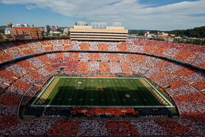 The fourth-largest venue in the country boasts the familiar checkerboard orange and white squares in the end zones, the Vol Navy (boaters dock on the banks of the Tennessee River just outside Neyland), the “I will give my all for Tennessee today” wooden sign that players tap on their way out of the locker room, and more.