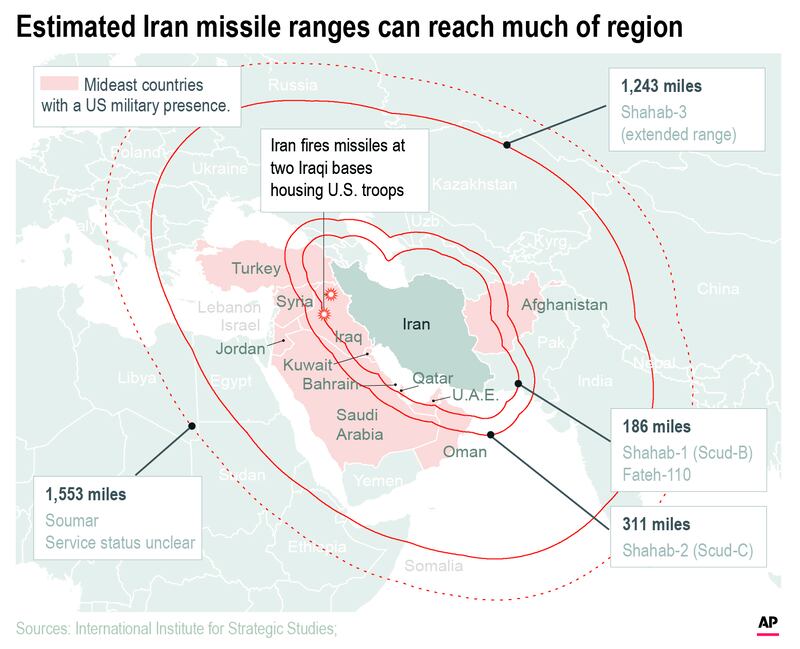 The Iranians fired a total of 15 missiles in Wednesday’s strike, two U.S. officials said. Ten hit the Ain al-Asad air base in Iraq’s western Anbar province and one targeted a base in Irbil in Iraq’s semi-autonomous Kurdish region. Four failed, said the officials, who were not authorized to speak publicly about a military operation.