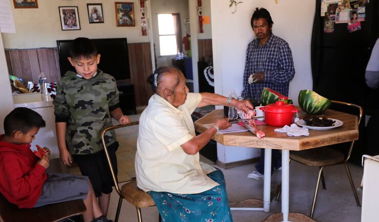 Among those families impacted was that of 88-year-old Anna Martin. Her son-in-law, Raye Sandoval, picked up the sheep given to her, and when he arrived at their picturesque enclave of houses, Martin sat at a picnic table covered in a brightly covered plastic table cloth talking with her daughter, Doris Sandoval, as she made tortillas for the eventual feast.