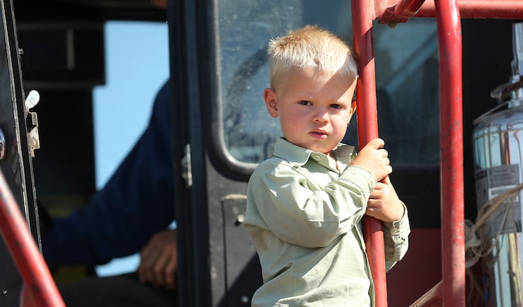 Last week Hege, a farmer and bishop of the Northern Utah Mennonite Church, watched as his sons operated two red combines in a neighbor’s wheat field. Vernon Hege, accompanied by his 3-year-old son Leroy, drove one thrashing machine while 13-year-old Adrian Hege steered the other harvester. When each bin was full, the brothers took turns dumping grain into semitrailer parked nearby.