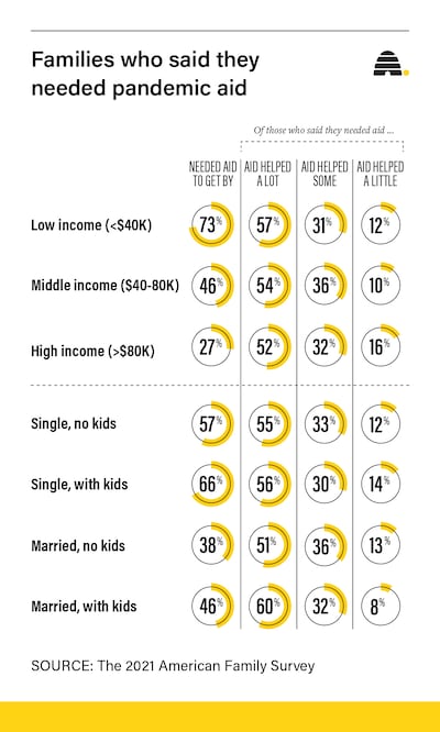 The need for assistance was highest among single parents, who were more likely to say they had experienced a serious economic crisis during the pandemic, and also the most likely to still be continuing to struggle.