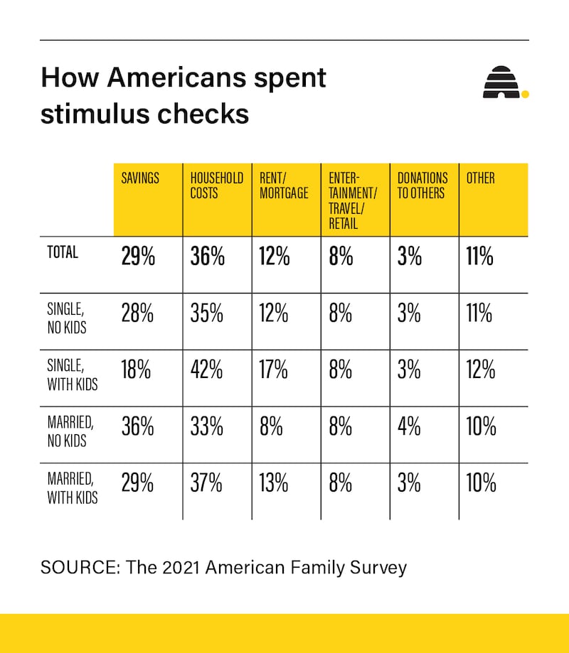 As for how the stimulus checks were spent, married Americans were more likely to put the money into savings, which was a concern of economists since the aid package, in addition to helping families, was also meant to be adrenaline for the U.S. economy.