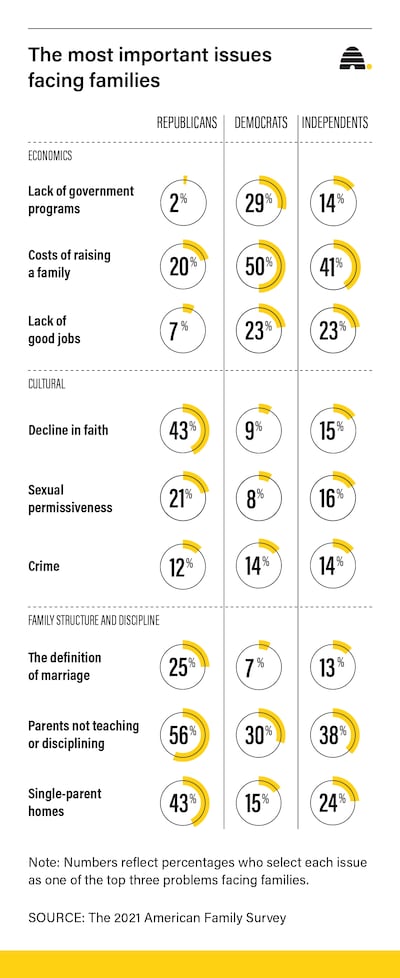 This year, fewer than 1 in 10 Democrats picked cultural issues like sexual promiscuity or a decline in faith when asked to choose three problems confronting American families. Republicans, on the other hand, were more likely to choose cultural issues than work demands, lack of good jobs and even crime.