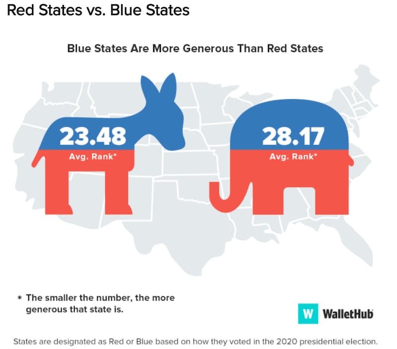The Beehive State bucked a trend WalletHub identified in its 2020 analysis: Blue states are more charitable than red states. The political color label was based on the 2020 presidential election. Incumbent President Donald Trump won Utah, which has long been considered one of the most Republican states in the nation.
