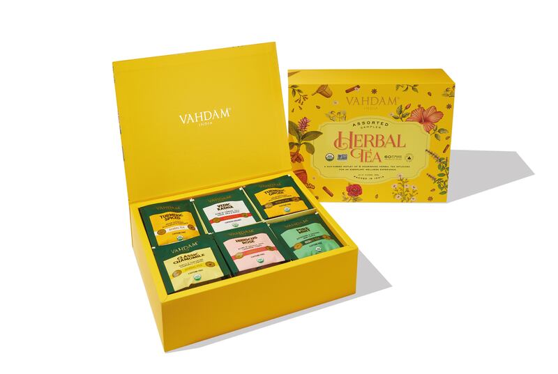 The sampler set includes six blends and 60 bags of tea. They’re vegan with no caffeine.