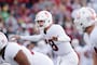 “I think you put the film on now and he doesn’t look like a guy who’s in the first half of his first year starting. He looks like a veteran. Dare I say he looks like one of the best, if not the best, quarterback in our conference from time to time. He can reach those heights,” he said. “I’m looking forward to that continued growth. ... He’s striving to get better. He works really well. He’s a great listener and a great learner. He learns from experience and he learns from the room. I’m excited to see this second half of the year being better than the first half.”