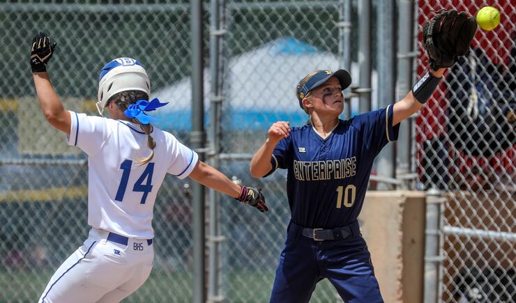 “We knew that we would come back even if they were up by two, with our bats. We told our pitcher (Blakelee Christiansen) that we had her back, that we’d get the runs for her,” Enterprise head coach Katye Jones said. “Little by little (we score runs). We lay off the high ball and get the pitches we want. When their pitchers make mistakes, we just stay focused, put our head down and watch it hit the bat.”