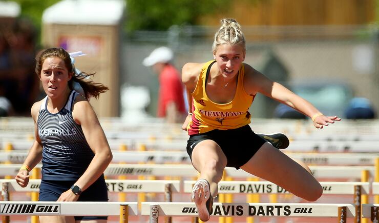 100 hurdles — 1. Eliza Smith, Bingham, 14.79; 2. Aniston Haycock, Davis, 15.02; 3. Kaitlyn Richins, Layton, 15.14; 4. Brielle Davis, Copper Hills, 15.92; 5. Alyssa Gregory, Westlake, 16.11; 6. Nadine Dumsa, Jordan, 16.31; 7. Sarah Swett, Riverton, 16.35.