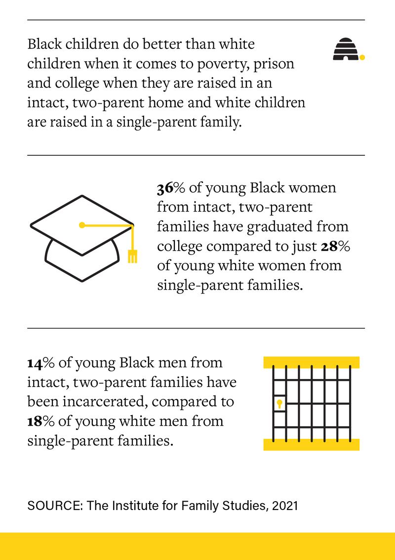 Wilcox called it “interesting that black children from intact, two-parent families do better than white children from single-parent families when it comes to poverty, prison, and college graduation. This tells us that strong and stable families matter for kids of all races.” And he called it “striking” that young men — Black or white — from nonintact families are more likely to go to prison than graduate from college.