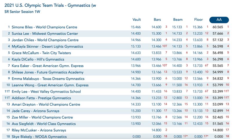 The top two finishers at the conclusion of the two-day competition are guaranteed a spot on the Olympic team. After Day 1, those guaranteed berths seem all but wrapped up by Biles and Lee.
