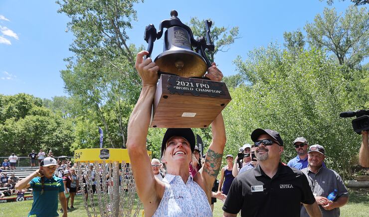 Catrina Allen earned her second world title, topping defending and five-time champion Paige Pierce. The two had seesawed the lead throughout the week and Saturday. It looked like Pierce had locked things up after she hit a 60-foot putt to save par while Allen bogeyed 16 for a two-shot difference, but the final two holes favored Allen, who shot even par while Pierce was three over to fall just short of Allen.