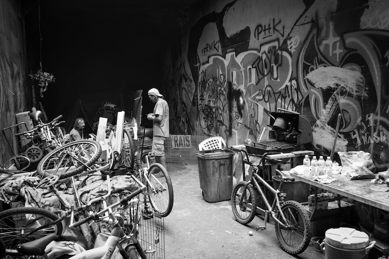 Nearly everyone in the tunnels lives with some sort of addiction, but many have also gathered enough discarded items from above to carve out some semblance of a home. They have beds with bed frames, tables with chairs, coolers and bicycles and barbecue grills — all pulled from curbs or dumpsters. A lot of the beds and bookcases sit on homemade stilts a foot or two off the ground, because when the water comes through, it comes fast and hard, and sometimes it sweeps away everything it touches.
