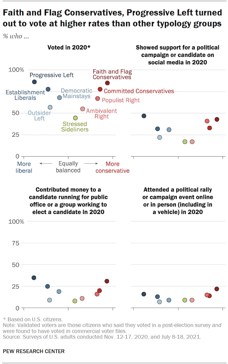 The findings matched other Pew polling showing those on the ends are more likely to have voted, donated to a candidate or political group or attend a campaign event in 2020. These are the true believers.