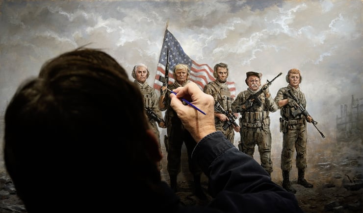 Why would an unpretentious, once modestly-successful landscape artist dive headfirst into a minefield of politics-by-paintbrush? A piece in The Atlantic speculates that his work is primarily for future generations, nothing more; others say he’s merely holding a mirror up to our own political age.