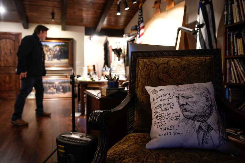 But upon closer inspection, it becomes clear that McNaughton’s space is uniquely his own — the rendering of “Washington Crossing the Delaware,” for instance, features the former president Donald Trump instead of Washington — and the crew in the boat paddles across a swamp, with the U.S. Capitol rotunda glowing in the background.