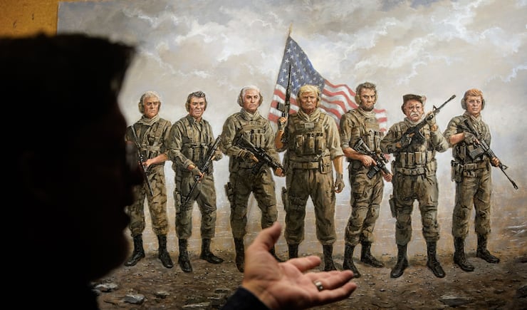 By that metric, McNaughton’s latest release was a smashing success. “The Magnificent Seven” — the name pays homage to the classic 1960 Western film — depicts Washington, Jefferson, Lincoln, Roosevelt, Kennedy and Reagan holding rifles and flanking a serpent-crushing Donald Trump. The piece sparked a firestorm on Twitter and was sarcastically lauded by New York Magazine as “something to behold.”