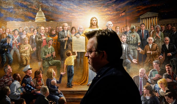 The gargantuan painting, “One Nation Under God,” portrays Jesus centered between the U.S. Capitol and the Supreme Court with the U.S. Constitution in hand. Surrounding him are throngs of people: Founding Fathers, soldiers from notable U.S. wars, and Davy Crockett, among others. On Christ’s right hand is a marine and a schoolteacher; on his left, a Hollywood actor and a “liberal” journalist.