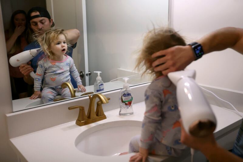 Her little sister Ruby, 20 months old, watches intently and tries to say the words, too, ending with her own name. When they’re done, they’ll scamper off to play or sing or build something.