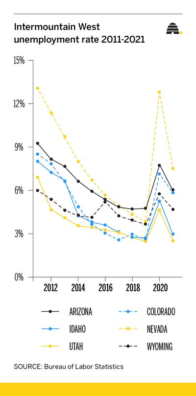 The average unemployment rate for Arizona, Colorado, Idaho, Nevada, Utah and Wyoming combined last year was about 5%, down from 2020’s average unemployment rate of 7.4% in the region, but still above the 3.4% in 2019.