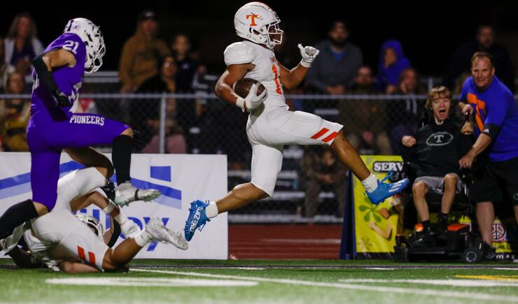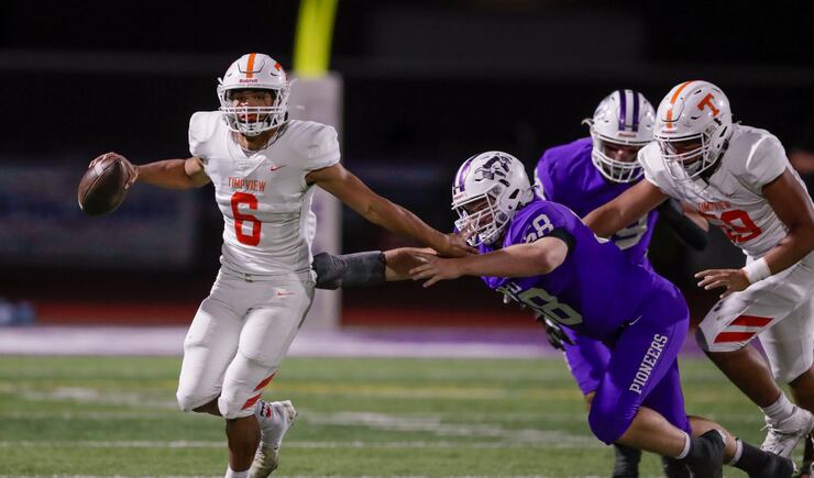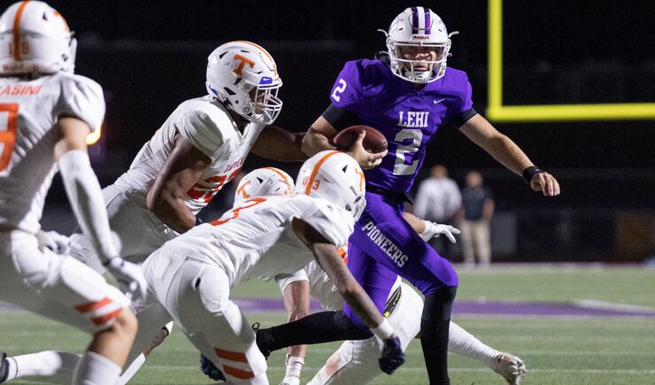 In a showdown between the top two teams in 5A, No. 1 Lehi scored with less than 90 seconds remaining to edge the T-Birds to improve to 9-0 on the season as Kolton Tanner hauled in a 15-yard TD reception from Jackson Brousseau with 1:21 left in the game. It was Brousseau’s third touchdown pass of the game. Isaiah Vaea had temporarily giving Timpview the lead with 4:05 remaining with his second rushing touchdown of the game, but Brousseau engineered a go-ahead drive and then Lehi’s defense got the late stop to preserve the win.