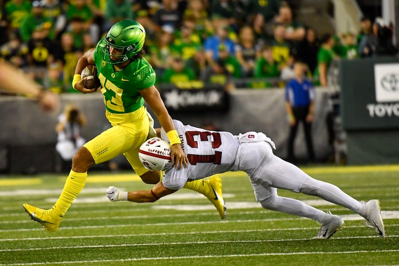 And Oregon boasts a pair of standout running backs — Mar’Keise Irving (120 carries, 837 yards, two TDs) and Noah Whittington (103 carries, 623 yards, four TDs).